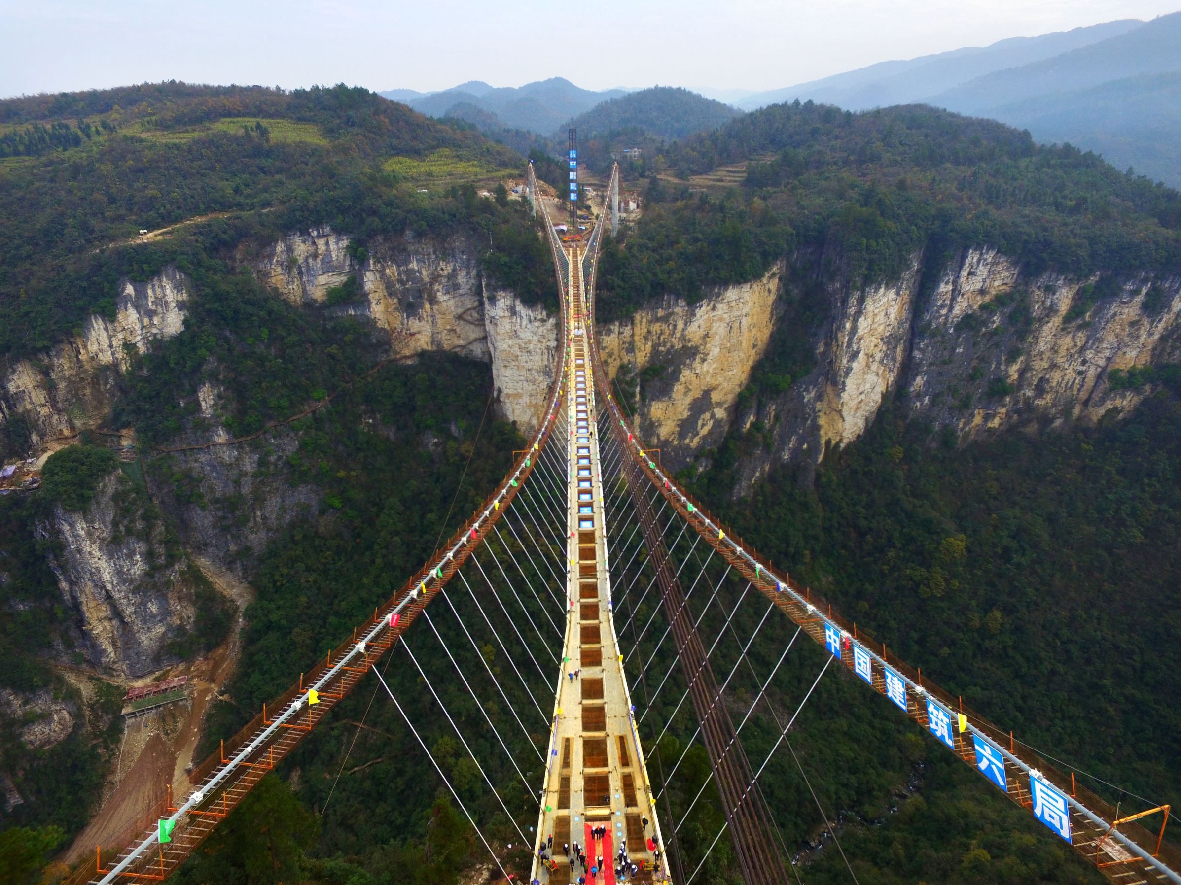 A mais longa e mais alta ponte com fundo de vidro do mundo construída acima de um canyon tem 374 metros de comprimento e 299 metros de altura. Para evitar a vibração na ponte, bolas de vidro gigantes são colocadas no chão.